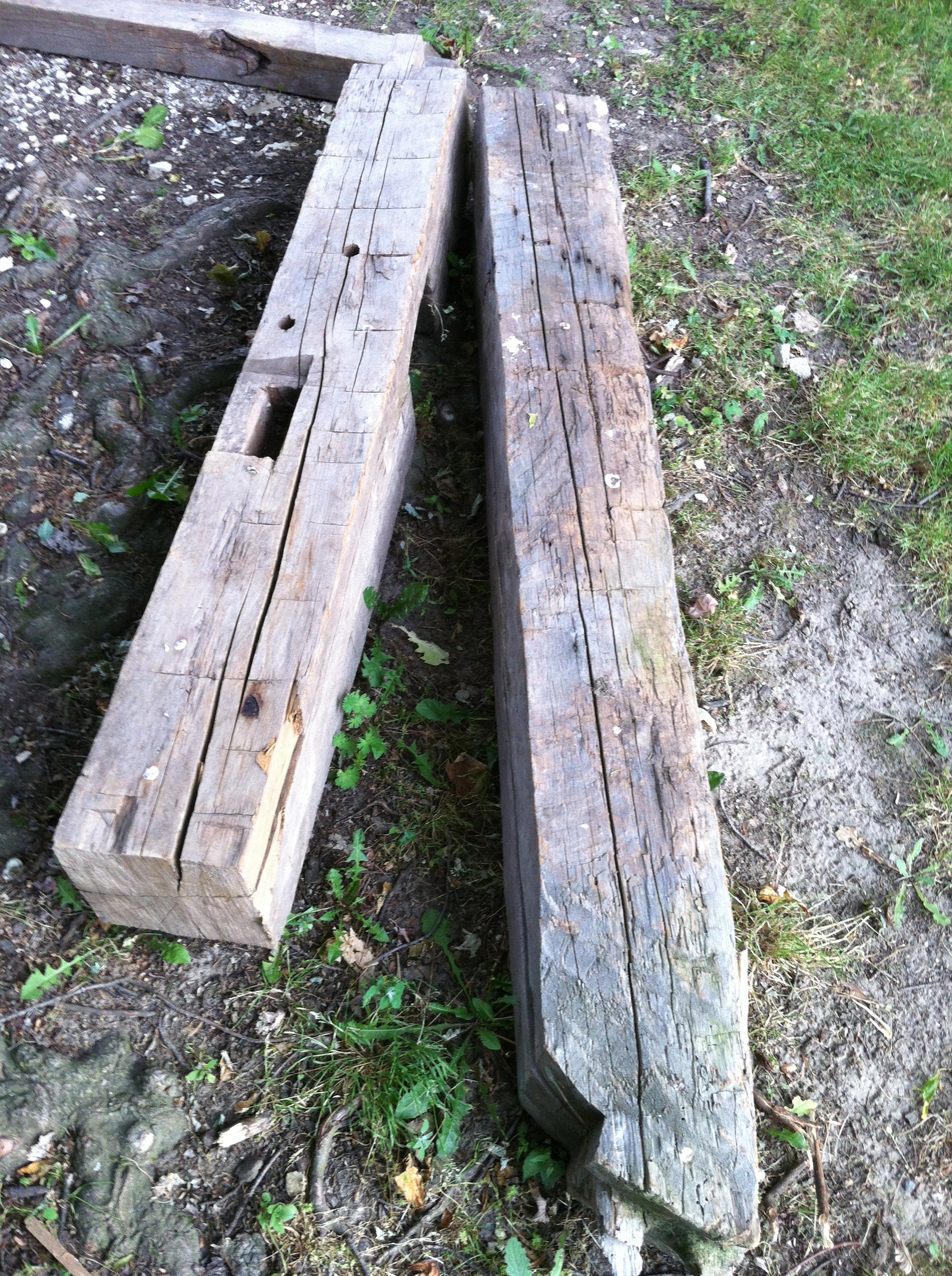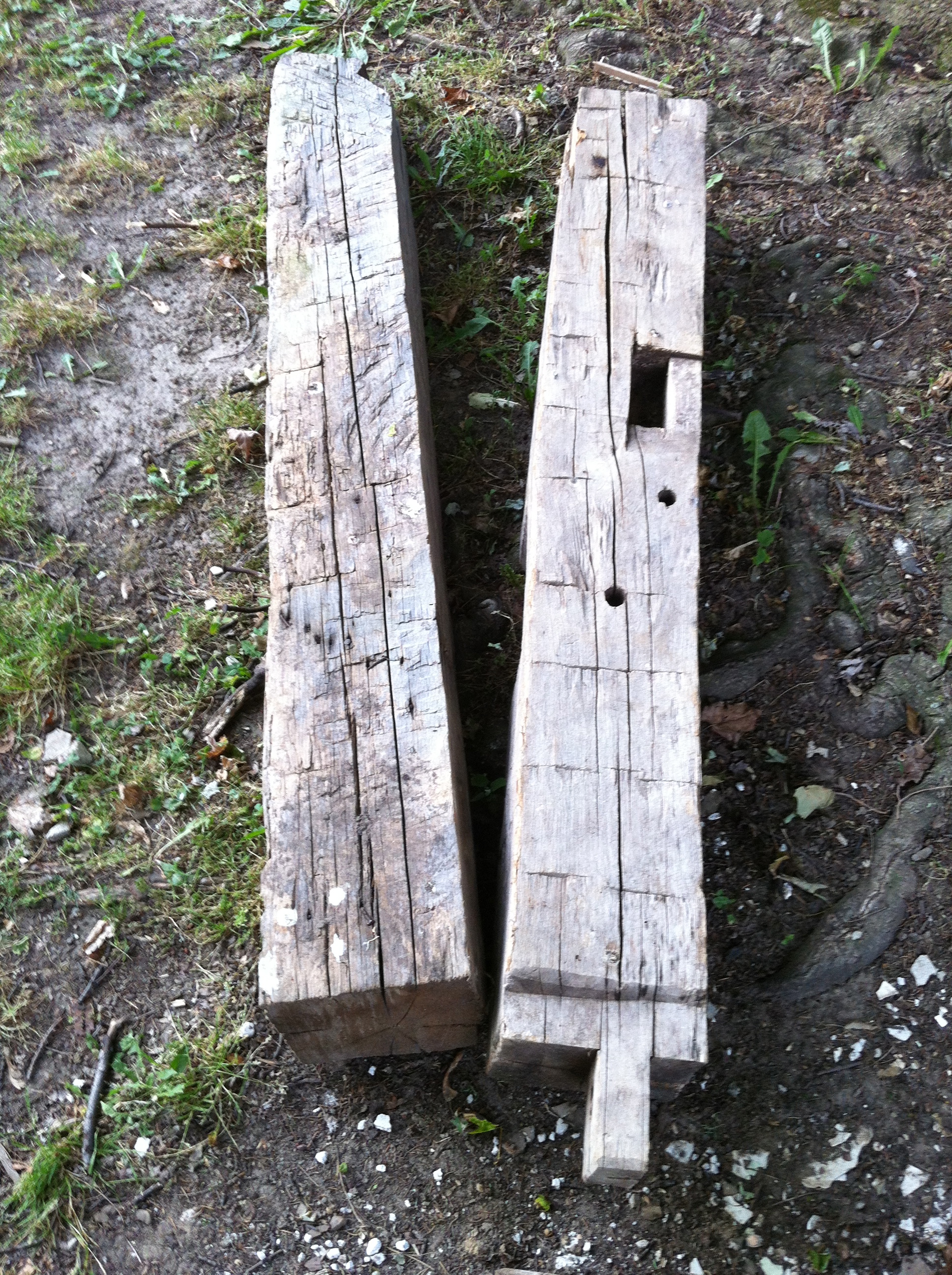 Here are two beams that once were one. Alas, they have been cut in two, so one is 5 ft and the other is 5 and a half. 8 x 8 hand-hewn just like the previous one.