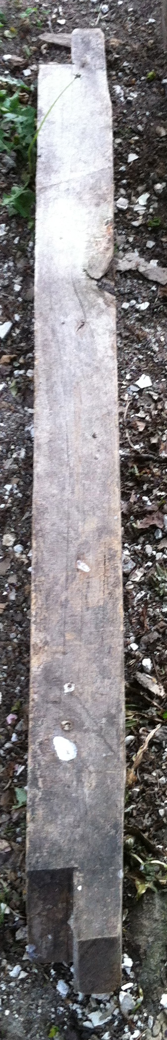 This beam is about 11 feet long and has a tapered end. It’s about 3”x6” around. There are some old square nails in it and a metal fastener on the far end.