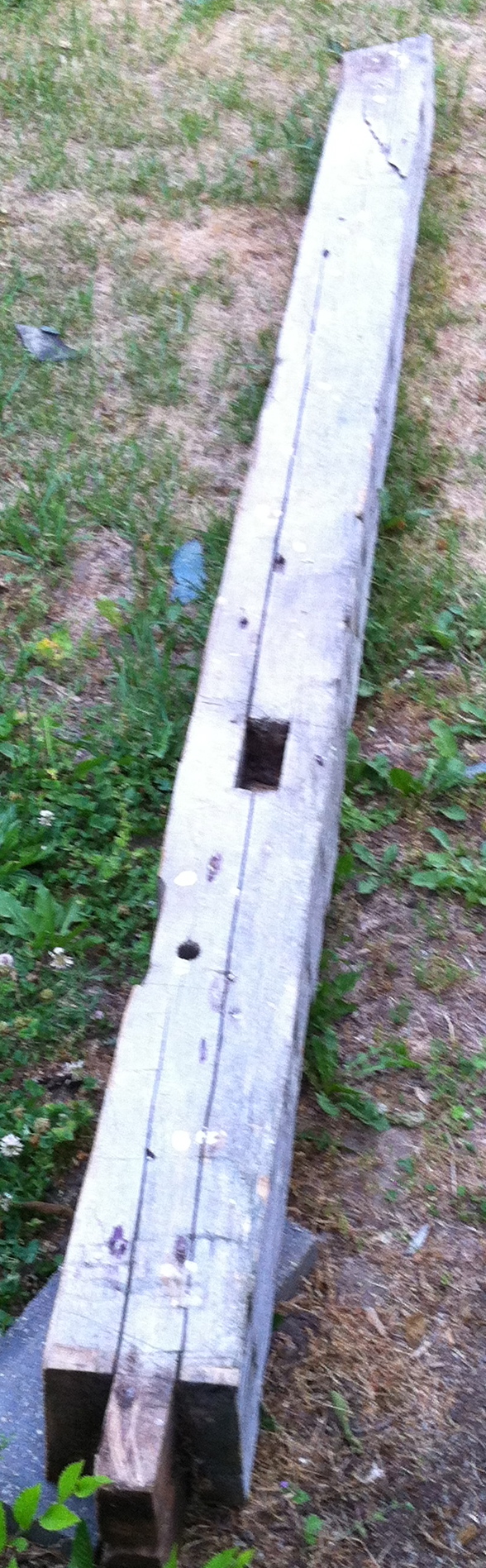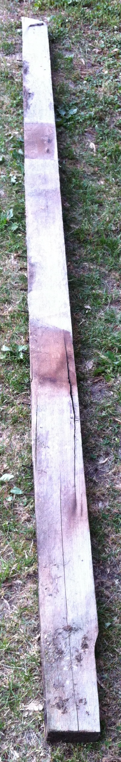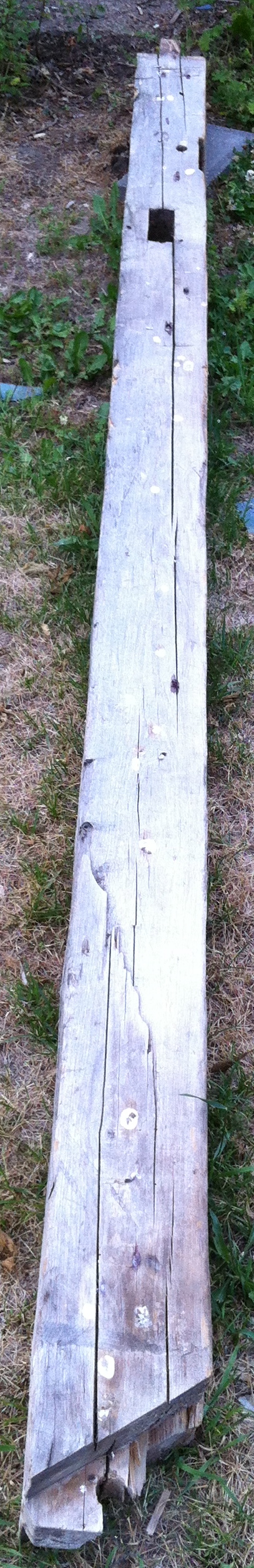 This beam is about 11 feet long and has a tapered end. It’s about 3”x6” around. There are some old square nails in it and a metal fastener on the far end.